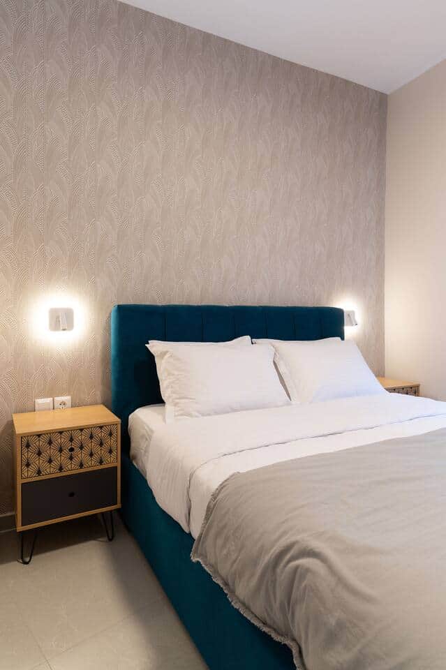 The romantic bedroom combines elegance and comfort, offering a peaceful environment for relaxation. The bathroom, with tiles in geometric patterns, leaves the visitor with a sense of luxury and elegance.